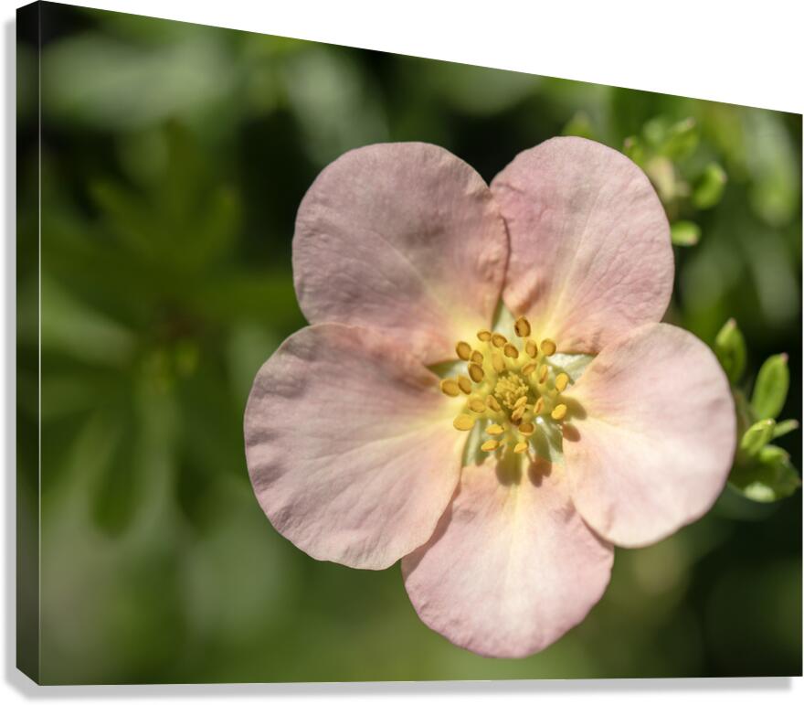 Potentilla Fruticosa Glamor Girl or Pink Beauty also known as Shrubby or Bush Cinquefoil and Golden Hardhack. Blurry green background.