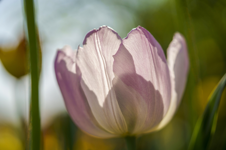 See-through pink Tulip. Blurry background composed of the sky green grass and yellow Tulips. Photo taken at the Canadian Tulip Festival in Ottawa.