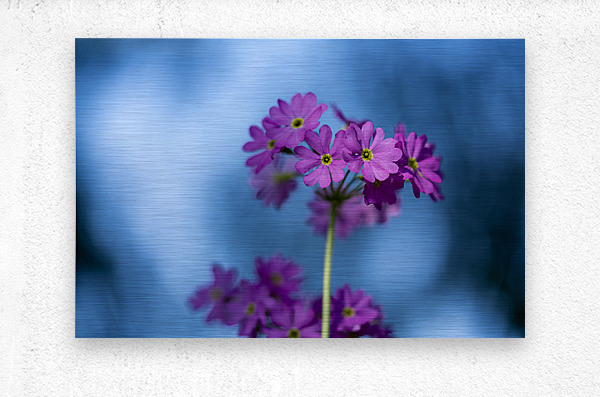 Pink Primula flowers against a blurry blue sky.