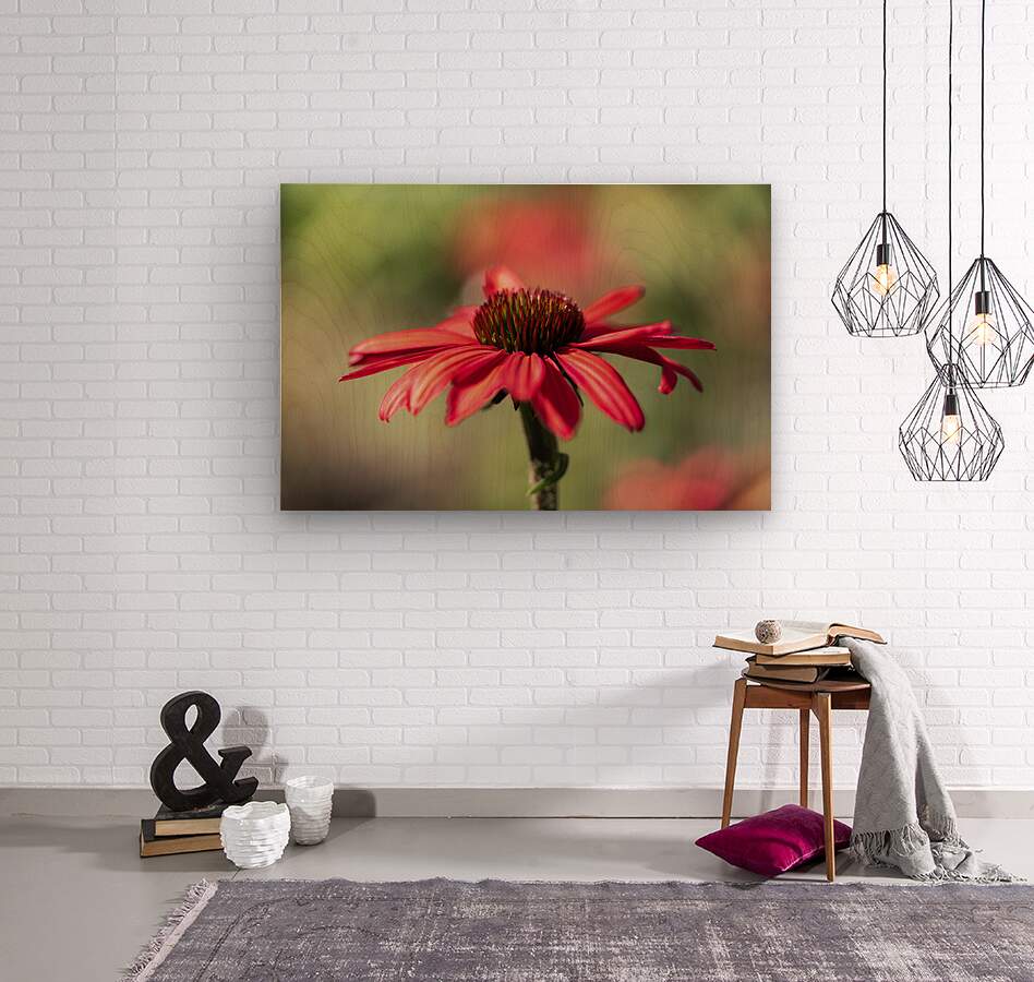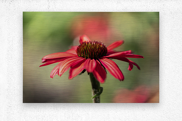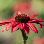 Red Echinacea or Coneflower on a blurry red and green grass background.