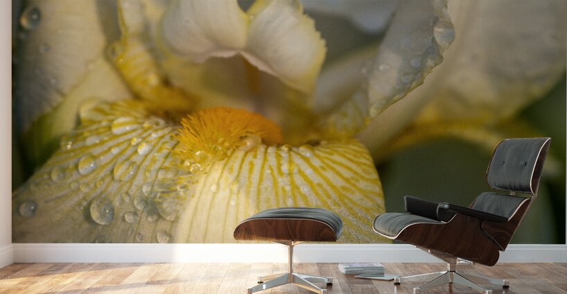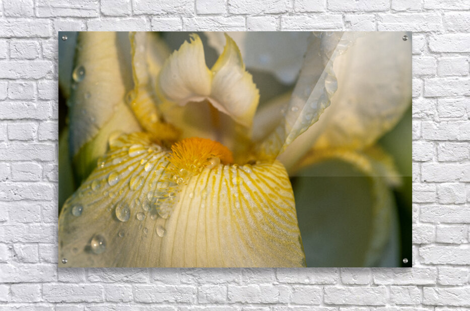 Close-up of a yellow Bearded Iris covered in morning dew.
