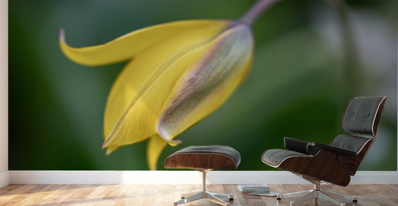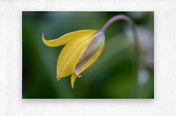 Bent yellow Tulip on a blurry green leaves background.