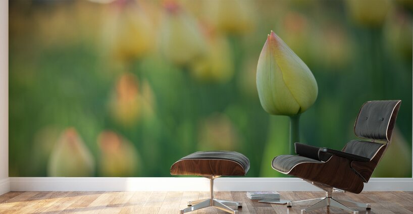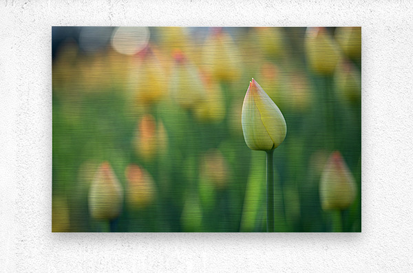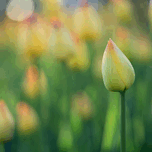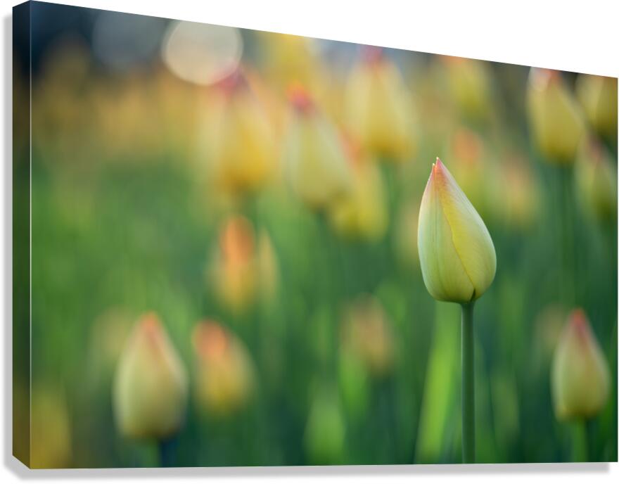 Yellow and pink Tulip buds in a blurry Tulip field. Photo taken at the Canadian Tulip Festival in Ottawa.