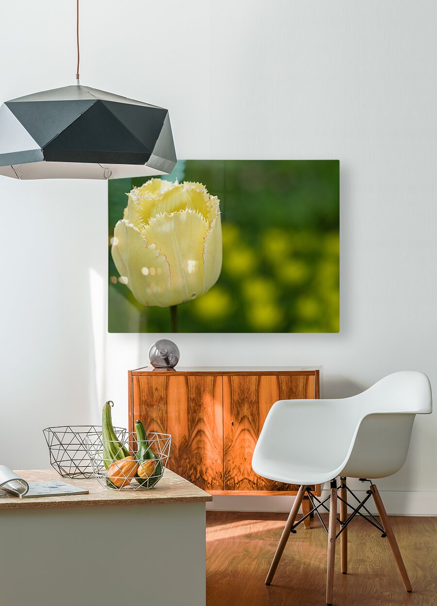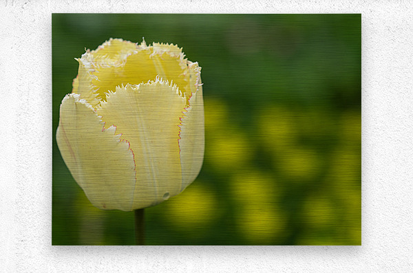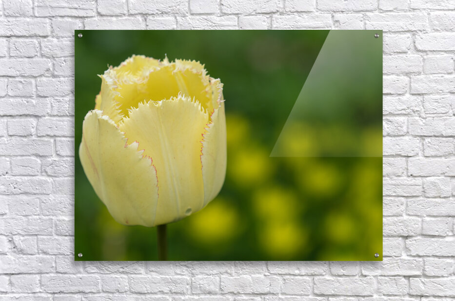 Closeup of a yellow Tulip with thin red fringes. Blurry grass and tulips in the background - sunny day. Photo taken at the Canadian Tulip Festival in ...[+]