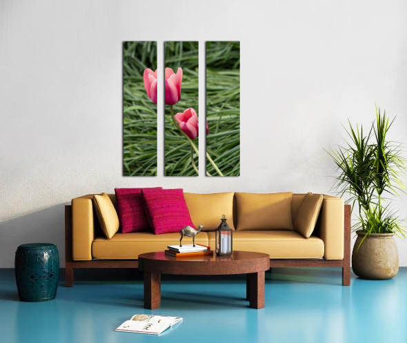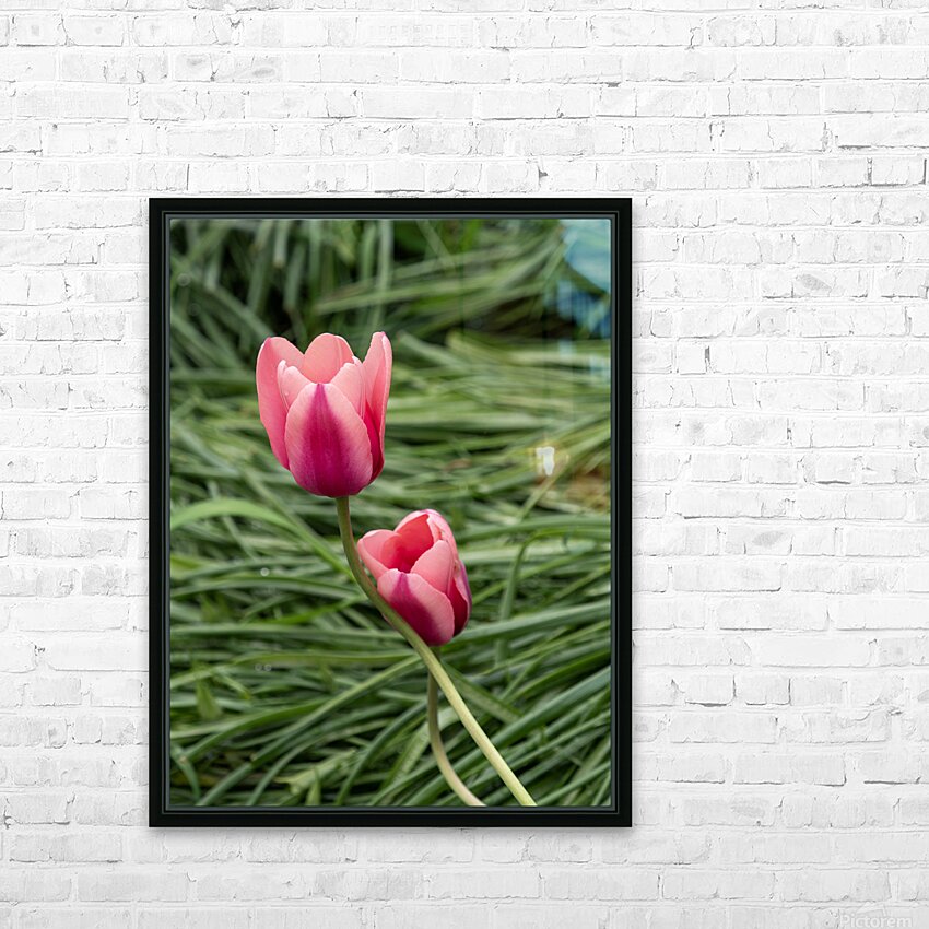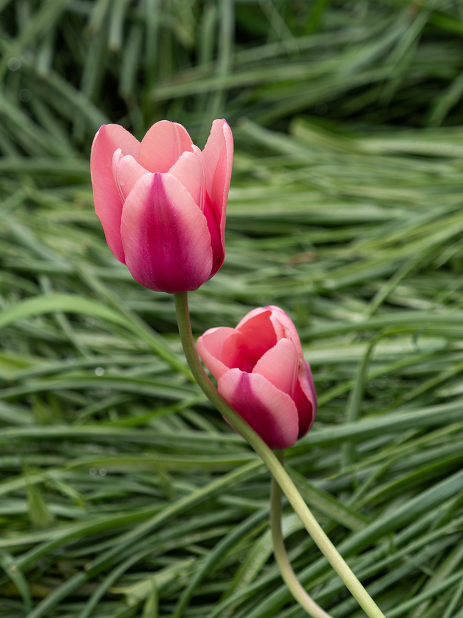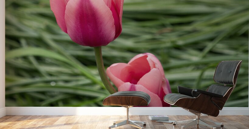 Two pink Tulips embracing in green grass. Photo taken at the Canadian Tulip Festival in Ottawa.