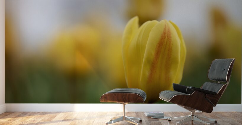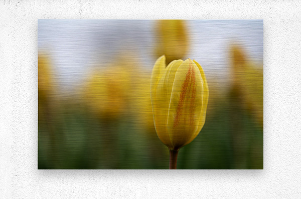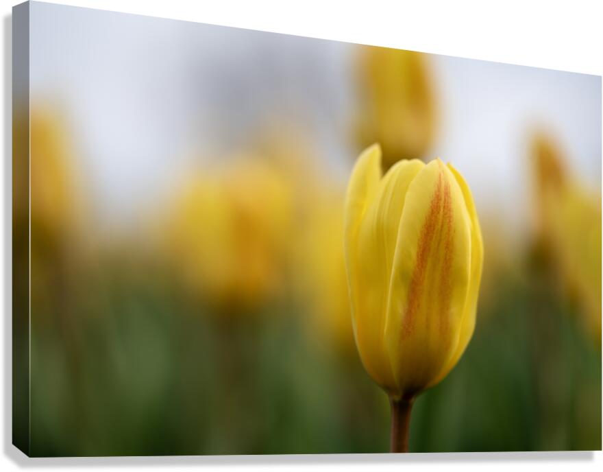 Yellow Tulip with a bit of red in a yellow blurry tulip field on a cloudy day.