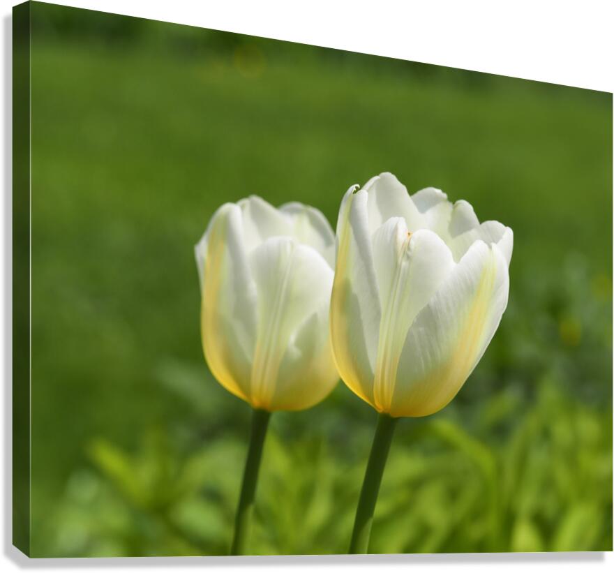 Two yellow and white Tulips in a blurry field - on a sunny day. Photo taken at the Canadian Tulip Festival in Ottawa.